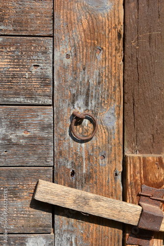 © nahhan, Fototapeta premium A close-up shot of an old wooden door featuring a weathered metal ring and a wooden latch, showcasing texture and patina