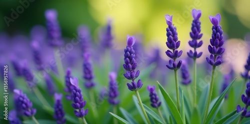 Naklejka premium A close-up shot of beautiful purple lavender flowers in full bloom surrounded by green foliage, fragrant, petals