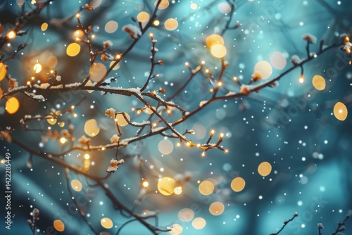 © Iftikhar alam, Fototapeta premium A close-up shot of fairy lights strung on snow-covered branches against a blurred background, Magical fairy lights twinkling softly