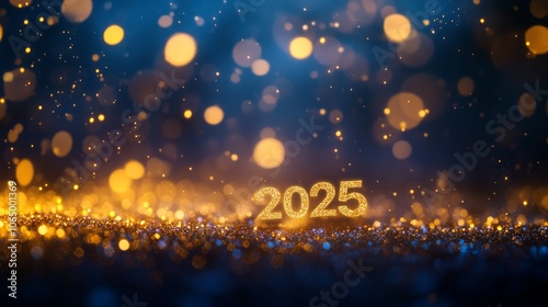 © Arifin Studio, Naklejka premium A close-up shot of 2025 in gold glitter on a blue background with bokeh lights.