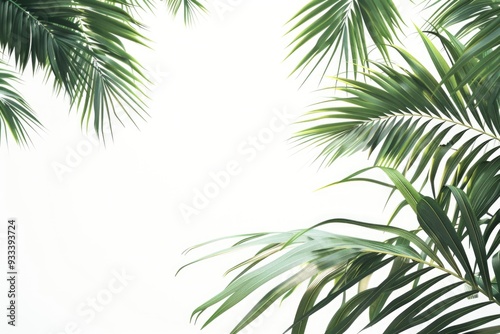 © Fotograf, Naklejka premium A close-up shot of palm leaves against a pure white sky, great for background or design use