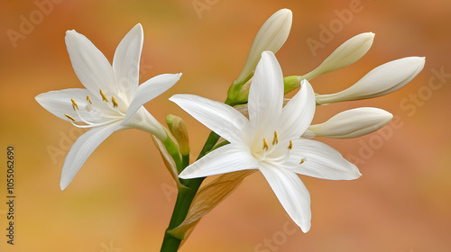 © ZEUS, Fototapeta premium A close-up shot of two white lilies in bloom against a soft orange background.