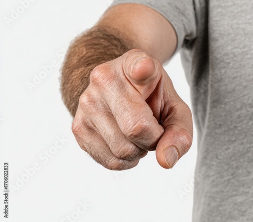 Fototapeta premium A close-up shows a person's hand with their index finger extended forward, against a stark white background, with a gray shirt sleeve visible