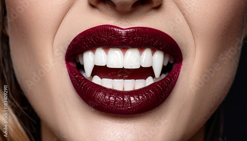 © arhi, Obraz premium A close-up shows glossy, dark red lips parted to reveal sharp, white vampire fangs and teeth, set on fair skin
