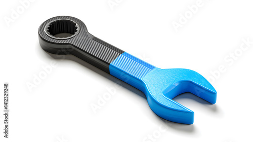 Obraz premium A close-up view of a blue and black adjustable wrench on a white background,...