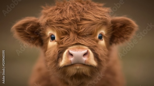 © Diffin, Fototapeta premium A close-up view of a brown cow showcasing its striking blue eyes, emphasizing the animal's unique features and gentle demeanor.