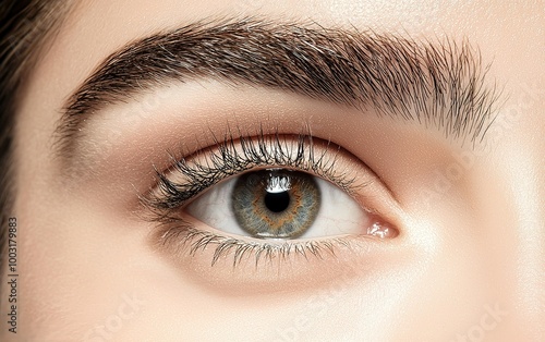 Obraz premium A close-up view of a captivating human eye showcasing intricate details of iris, lashes, and brows in serene soft lighting