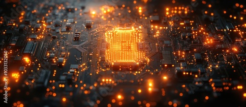 © Alienmarsh, Fototapeta premium A close-up view of a circuit board illuminated with glowing orange lights.