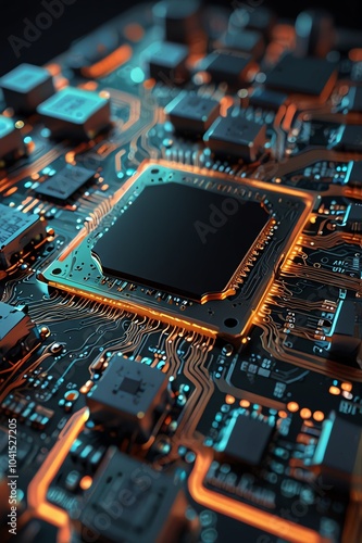 © Puchong, Obraz premium A close-up view of a circuit board with a central processor chip glowing with orange and blue light