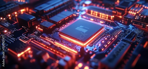 Obraz premium A close-up view of a circuit board with glowing components and a processor.