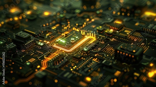 © Tina, Obraz premium A close-up view of a circuit board with glowing components and intricate pathways.