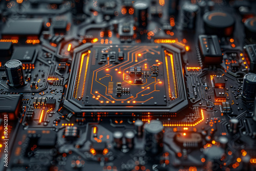 © Oleksandr, Obraz premium A close-up view of a circuit board, with intricate pathways and nodes highlighted to show data flow,
