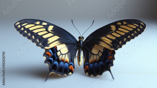 Fototapeta premium A close-up view of a colorful butterfly perched on a white background