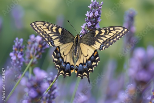 Naklejka premium A close-up view of a colorful butterfly with black and yellow wings, gracefully resting on vibrant purple lavender flowers, illustrating natural beauty and tranquility.
