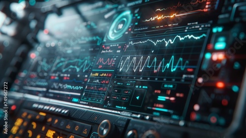 © Sodapeaw, Obraz premium A close-up view of a complex data analysis dashboard with multiple graphs and indicators in a high-tech environment.
