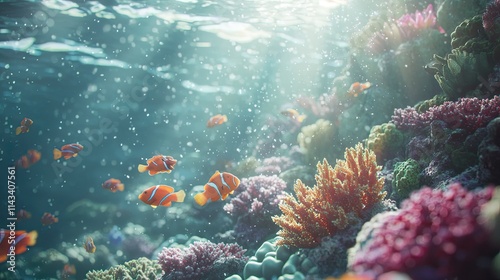 © kwanchaift, Fototapeta premium A close-up view of a coral reef bursting with bright corals and schools of tropical fish swimming around, illuminated by shimmering sunlight filtering through the ocean w