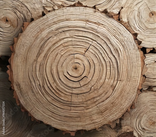 © Nipon, Fototapeta premium A close-up view of a cross-section of a tree trunk, revealing the concentric rings of the wood and the growth rings of the tree.