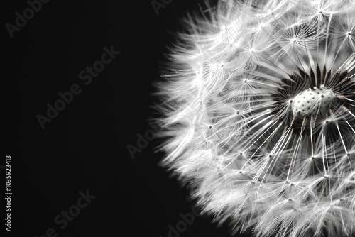 © Suphakorn, Fototapeta premium A close-up view of a dandelion with delicate seeds against a dark background