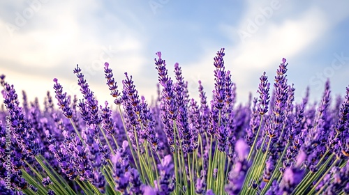 Naklejka premium A close-up view of a field of lavender flowers, with a blue sky and white...