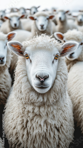 © Alina Tymofieieva, Naklejka premium A close-up view of a flock of sheep in a rural setting during the day highlighting their fluffy wool and curious expressions