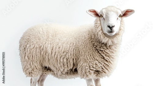 Obraz premium A Close-Up View of a Fluffy Sheep Standing Against a Plain White Background in a Farm Setting
