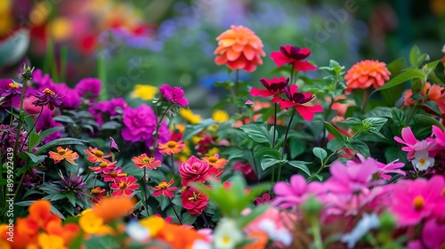 Obraz premium A close-up view of a garden filled with a mix of colorful flowers, capturing...