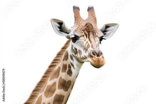 © Fotograf, Fototapeta premium A close-up view of a giraffe's face on a white background