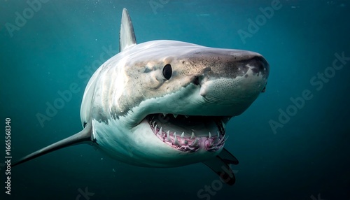 Naklejka premium A close-up view of a great white shark's formidable head and teeth, showcasing its powerful jaws underwater.