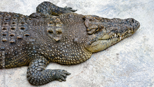 Fototapeta premium A close-up view of a large crocodile resting on a concrete surface,...