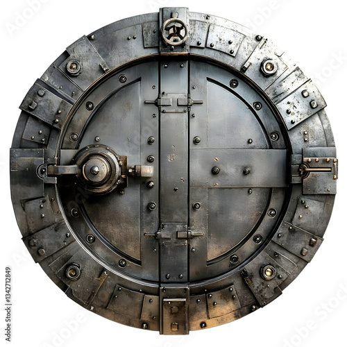 © sornram, Naklejka premium A close-up view of a large, round, metallic vault door with intricate details and a robust design, symbolizing security and protection.