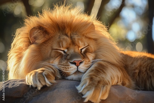 © Luna, Naklejka premium A close-up view of a lion resting on a rocky surface