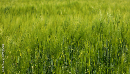 Obraz premium A close-up view of a lush green field swaying in the wind. The grain stalks...