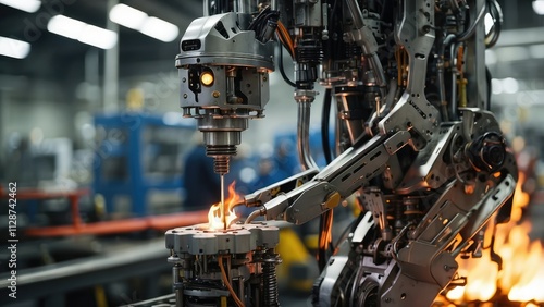 Fototapeta premium A close-up view of a modern automated assemly line featuring multiple robotic...
