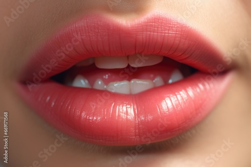 Obraz premium A close-up view of a person's lips with a toothbrush. This image can be used...