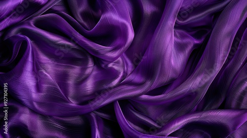 © vadosloginov, Obraz premium A close-up view of a piece of deep purple fabric that is draped and folded, showing its subtle shimmer and texture. The smooth, silky surface of the fabric catches the light, creating a mesmerizing an