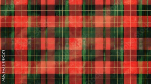 © vadosloginov, Fototapeta premium A close-up view of a red, green, and gold plaid fabric. The fabric has a subtle texture and the colors are slightly faded, giving it a vintage look. The plaid pattern is made up of thick and thin line