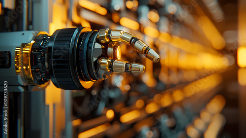 © dudesign, Obraz premium A close-up view of a robotic hand with intricate mechanical details, set against a backdrop of glowing machinery, highlighting advanced technology.