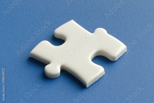 © kuuro, Obraz premium A close-up view of a single white puzzle piece resting on a blue background. symbolizing problem-solving and completion in various contexts like education and strategy