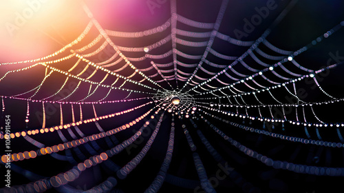 Naklejka premium A close-up view of a spider web glistening with dew drops, illuminated by...