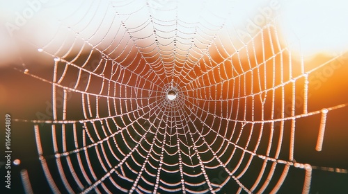 © Peter@studio5, Naklejka premium A close-up view of a spider web glistening with dew, illuminated by soft sunlight, creating a mesmerizing natural pattern.