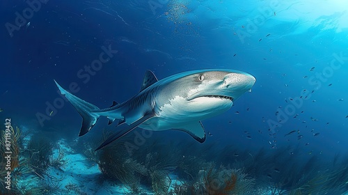 Fototapeta premium A close-up view of a tiger shark gliding through the clear blue waters,...