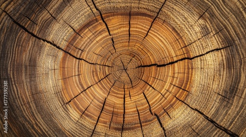 © Nice Seven, Fototapeta premium A close-up view of a tree stump, showcasing its intricate growth rings and cracks, highlighting the natural texture and age of the wood.