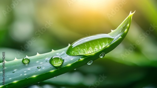 © Ivan, Fototapeta premium A close-up view of a vibrant aloe vera leaf adorned with sparkling water droplets, illuminated by gentle sunlight, surrounded by green foliage in a serene garden