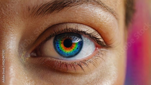 Obraz premium A close-up view of a vibrant, multi-colored eye with rainbow-like patterns and a detailed iris during a bright lighting setting