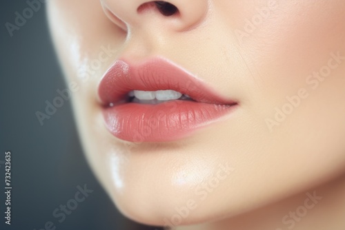 © Fotograf, Fototapeta premium A close-up view of a woman's face, focusing on her vibrant pink lips. This image can be used to showcase beauty, cosmetics, or fashion trends