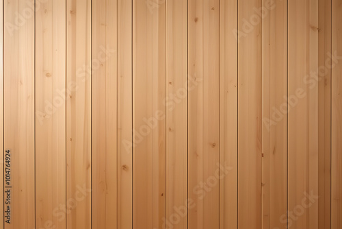 © Janos, Naklejka premium A close-up view of a wooden wall featuring vertical planks. The wood has a warm, natural finish with visible grain patterns and knots, creating a rustic and inviting atmosphere.
