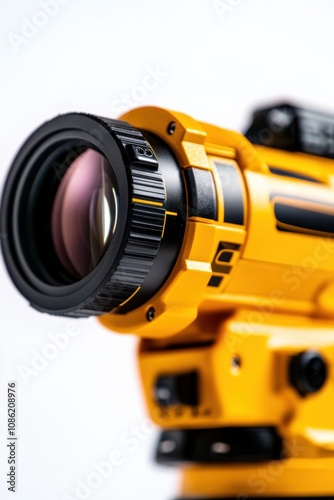 © lertsakwiman, Fototapeta premium A close-up view of a yellow surveying instrument lens, showcasing its intricate design and precision engineering.