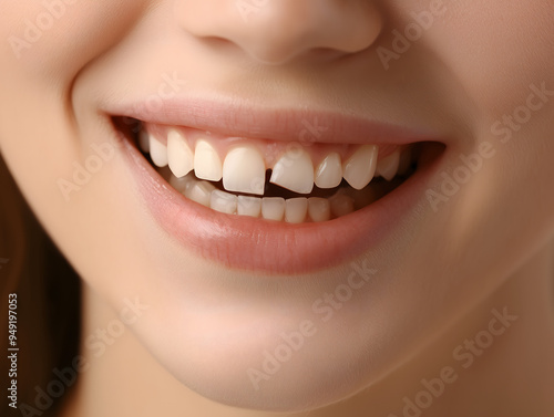 © forwforw, Fototapeta premium A close-up view of a young woman smiling with white healthy teeth, yet showcasing one broken tooth.