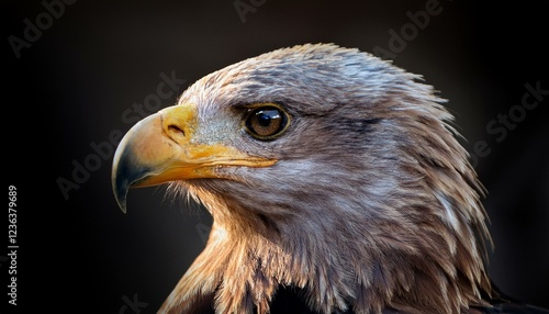 © Gianpietro, Fototapeta premium a close up view of an eagle s head against a dark background highlighting its feathers and eyes