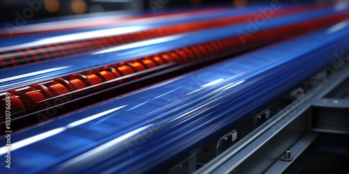 © Vibrant Visions Pixe, Fototapeta premium A Close-Up View of an Industrial Printing Press with a Blue Roller and Red Lights